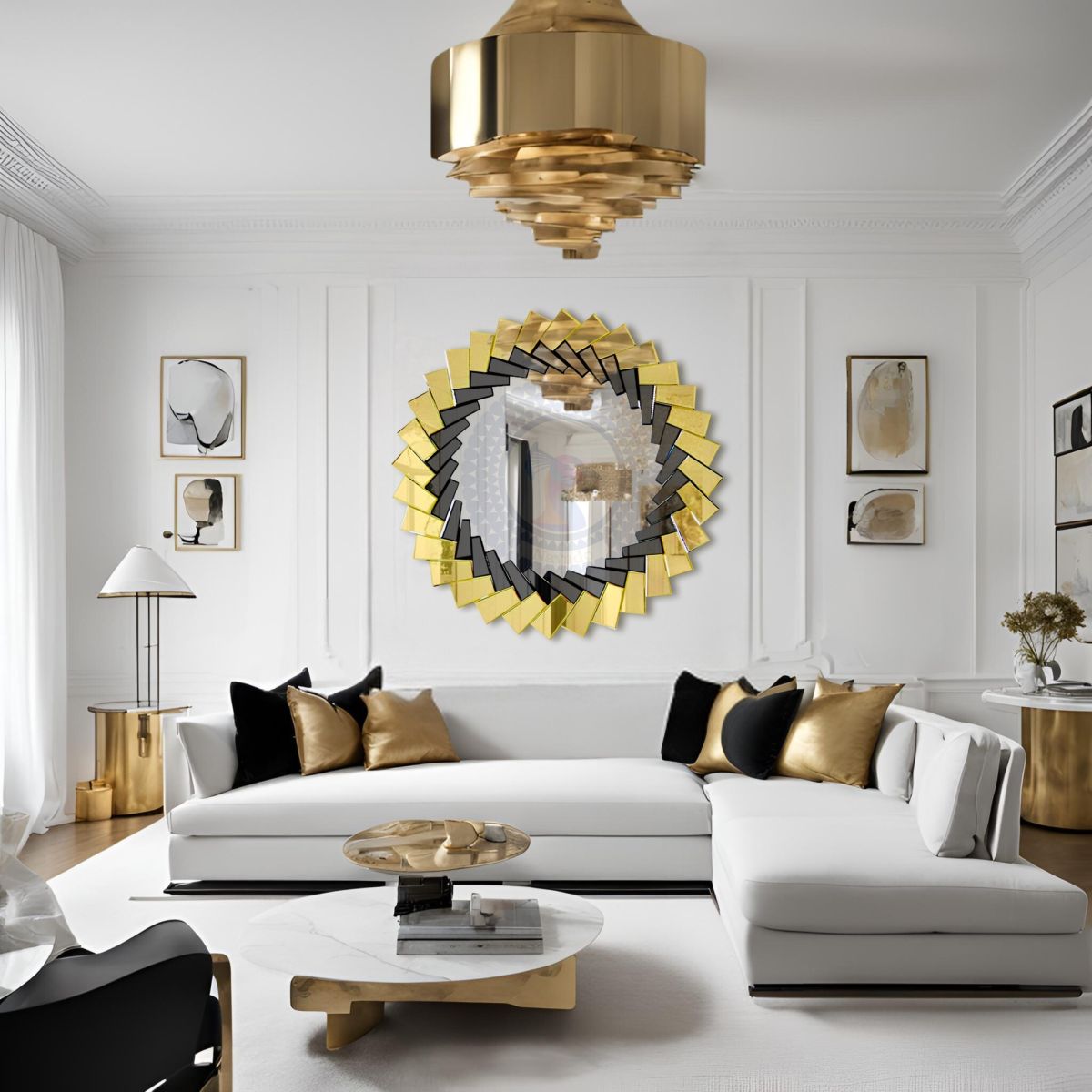 Each metallic panel is precisely cut and arranged in a kinetic pattern, echoing the form of a golden turbine or sunburst in motion. The dynamic composition brings a sense of movement and luxury to interiors, blending gold’s warmth with black’s strength. This is a mirror that celebrates both reflection and form—balancing utility with sculpture.