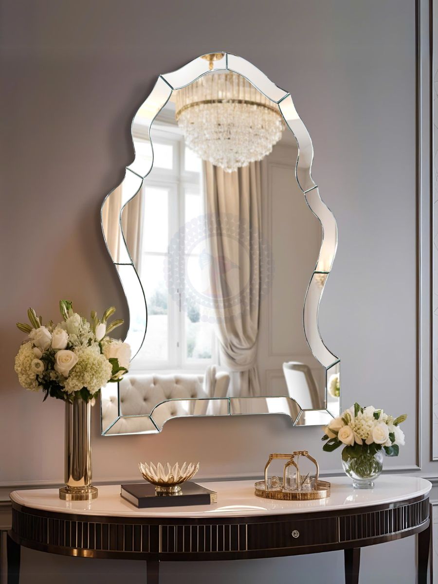 The Artistic Vanity Mirror NAV 2087 For Hotel Livingroom Projects reimagines traditional silhouette mirrors with sweeping curves and scalloped contours, bordered by precision-cut mirrored segments. Its fluid lines evoke the grace of flowing fabric or the contours of a Baroque frame, making it a poetic centerpiece for sophisticated interiors.