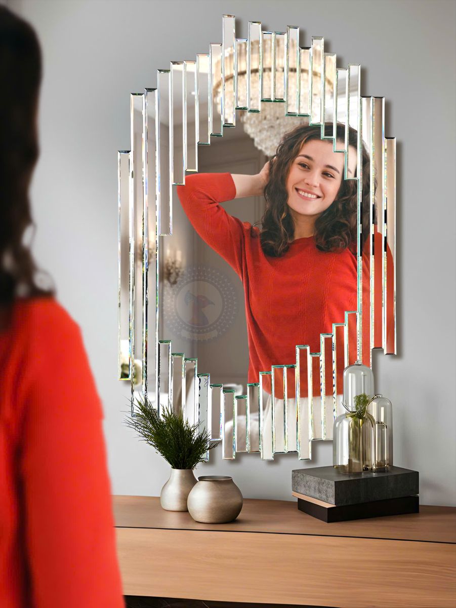 Luxury Artistic Makeup Mirror For Hotel Project NAV 2130 is a bold and elegant centerpiece that redefines luxury in modern design. With its innovative layered glass frame radiating out in a rhythmic pattern, this mirror creates a sense of movement and depth that enhances the ambiance of any space.