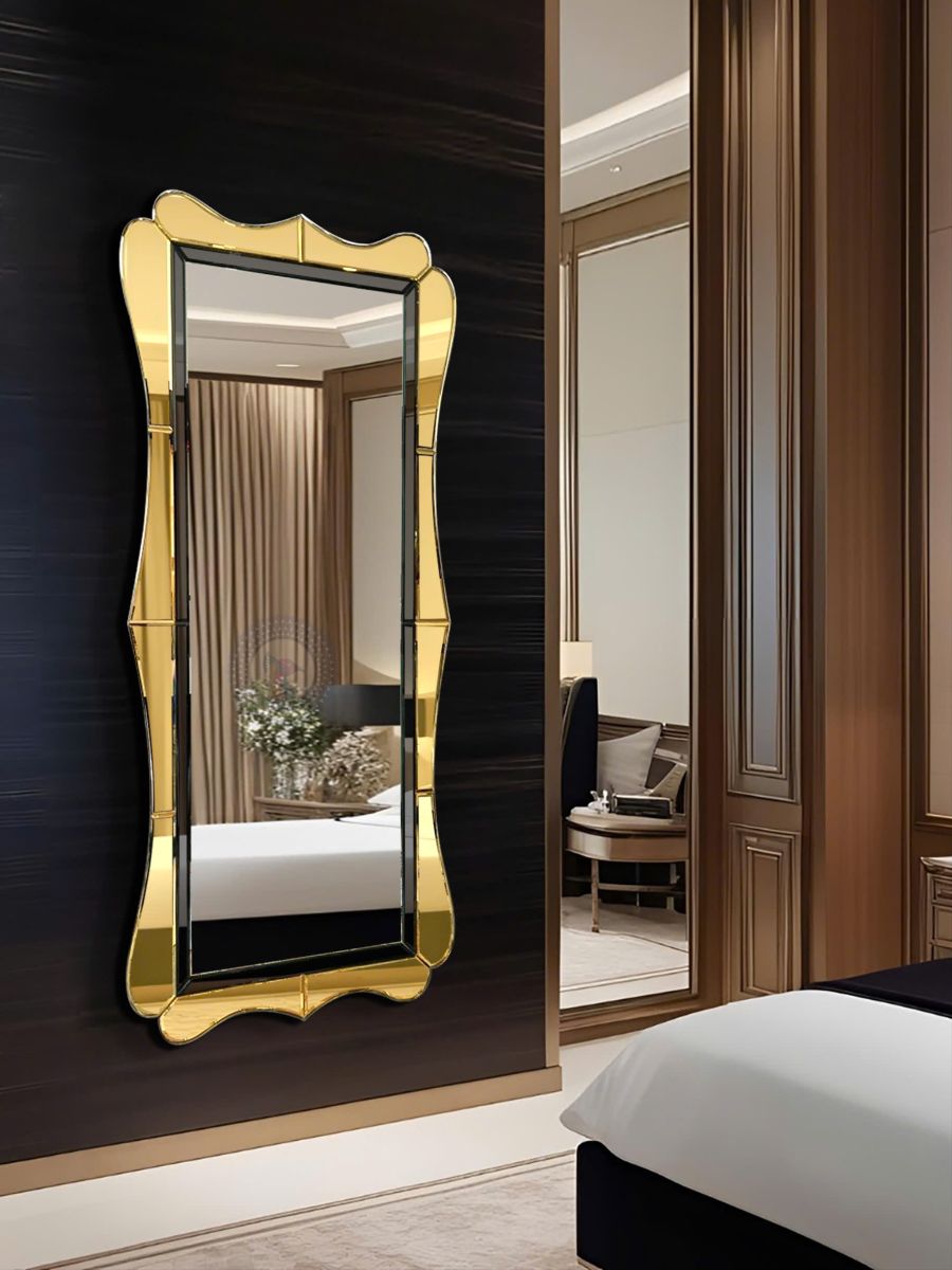 Perfect for high-end hotel rooms, bridal studios, and designer boutiques, this mirror is more than functional—it's an art piece. The beveled edge details and artistic contours reflect light beautifully, while the golden frame enhances the sophistication of its surroundings.