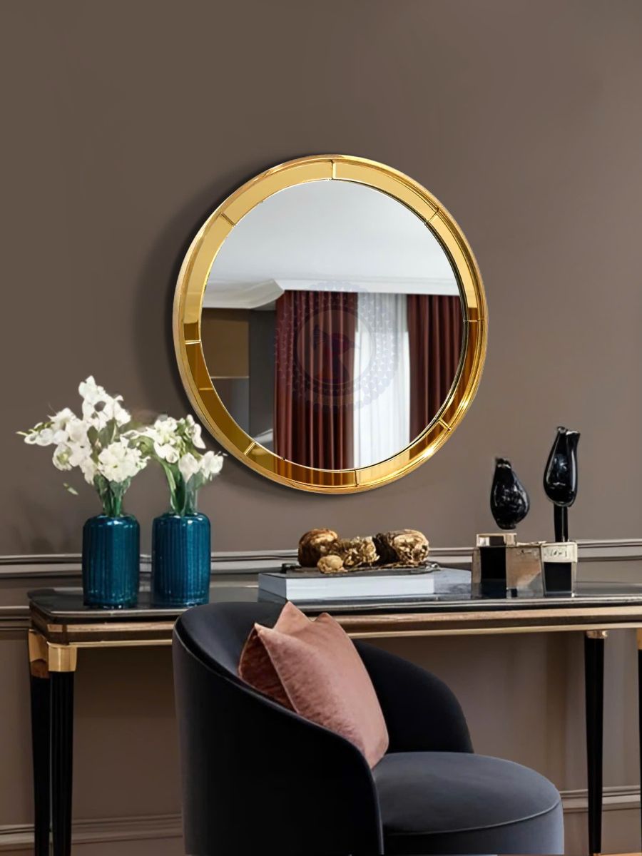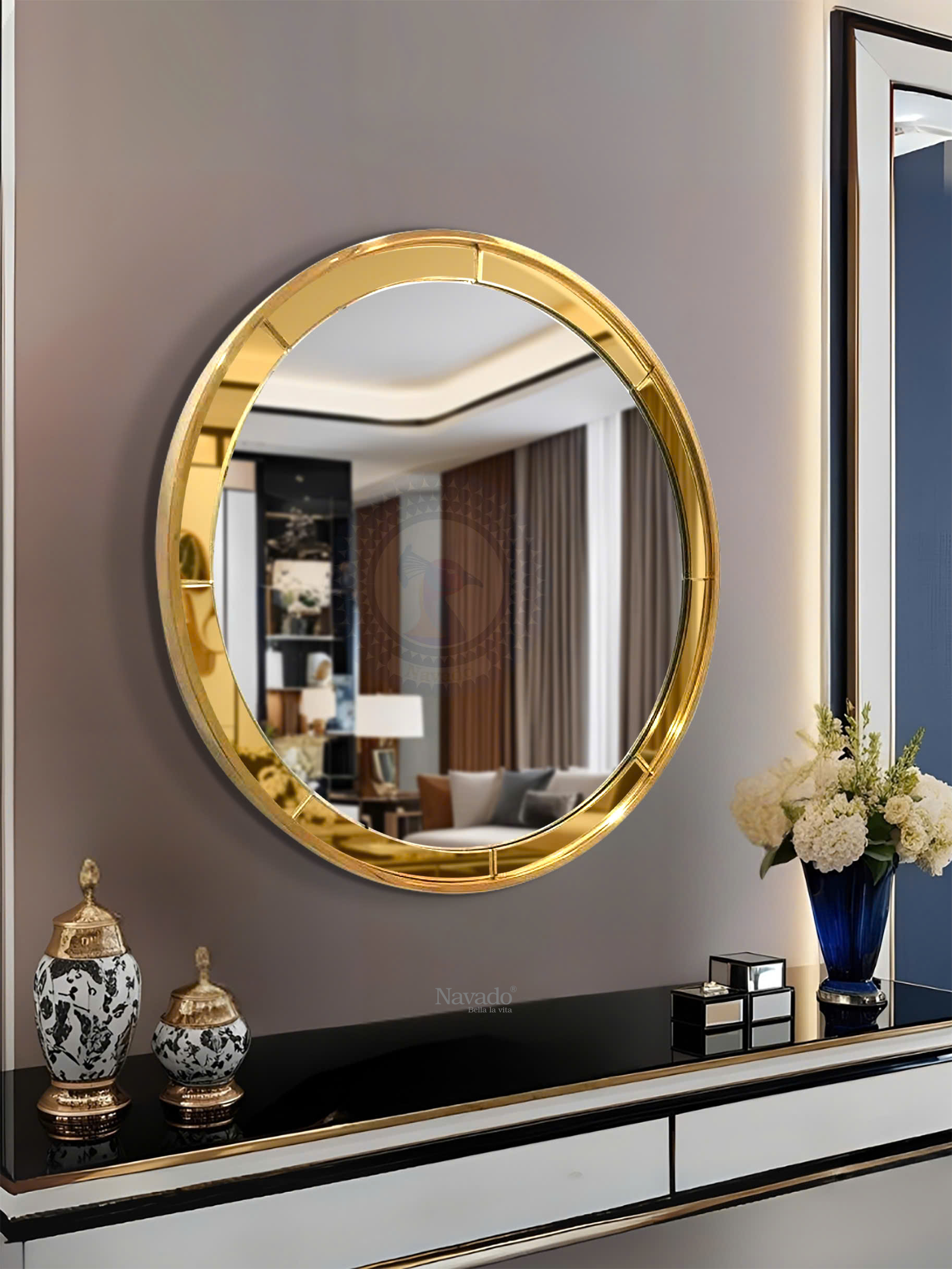 Luxury Artistic Makeup Mirror For Hotel Project NAV 2135B is a refined statement piece designed to elevate hotel room, vanity spaces, or elegant home interiors. Its perfectly round silhouette is accentuated by a stunning gold-trimmed frame, adding a sense of warmth, luxury, and timeless charm to any setting.