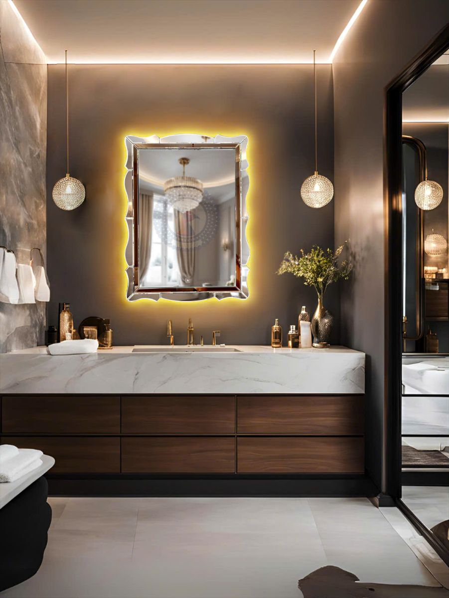 With its sculpted rectangular silhouette and glowing LED backlight, Artistic LED Mirror For Hotel Vanity Project Anna NAV 6002A is a refined statement piece for premium interiors. Its subtly contoured edges break the rigidity of traditional rectangular mirrors, while the warm backlit glow adds an ethereal ambiance to bathrooms, powder rooms, or hospitality suites.