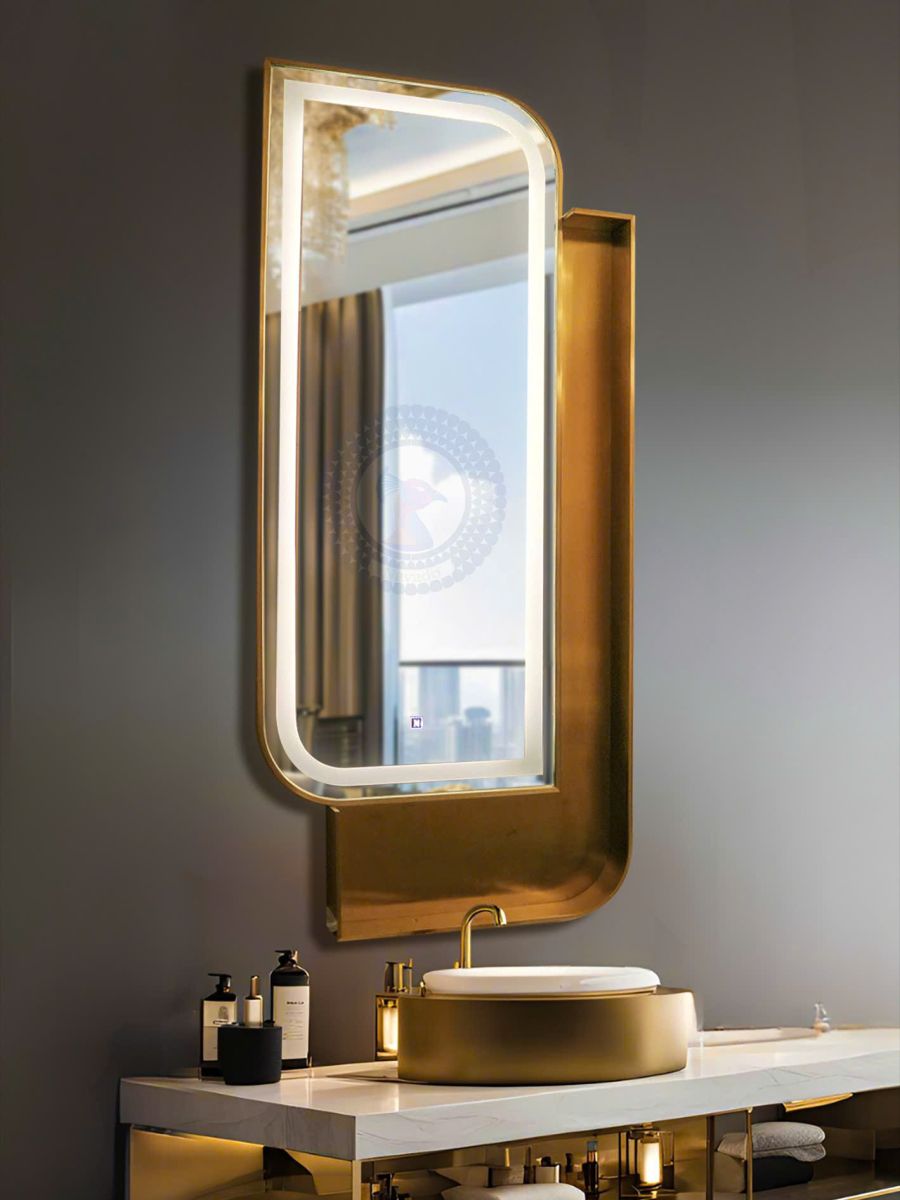 Bring a glow of precision and polish into your space with the Led Rectangle Makeup Mirror Luxor NAV 2123 For Hotel Bathroom Projects. Designed for discerning interiors, this vertically oriented mirror features a sleek, softly curved rectangle shape with embedded LED illumination. The warm golden frame adds an opulent accent, while the bright, even light enhances clarity—ideal for grooming, makeup, or ambiance.
