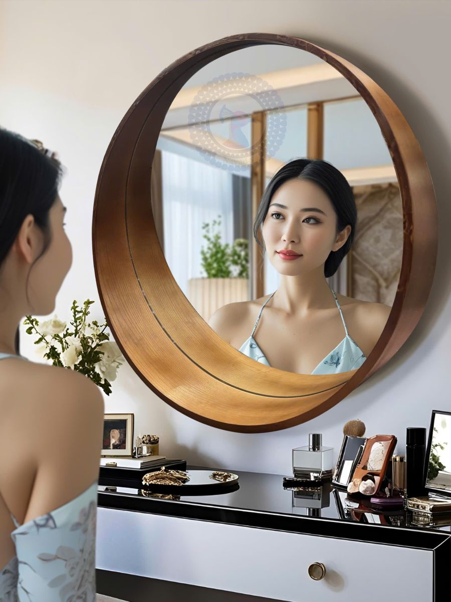 The Wooden Artistic Circle Vanity Mirror For Hotel Livingroom Projects combines clean circular symmetry with the inviting warmth of natural wood, offering a sophisticated yet grounded visual presence. Its deep wood-toned frame embraces the mirror like a sculptural ring, casting subtle shadows that add dimensionality to any wall.